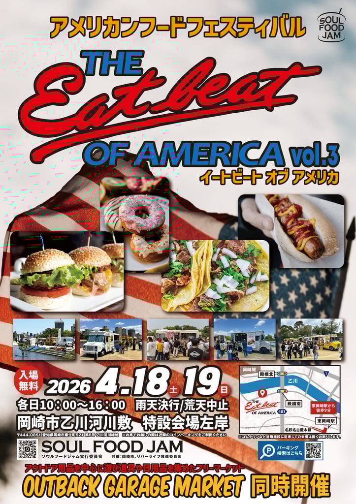 「The Eat beat OF AMERICA vol.3」は、岡崎市のアウトバックガレージマーケットと同時開催される、アメリカンカルチャーを食で体感できるフードフェスティバルです。