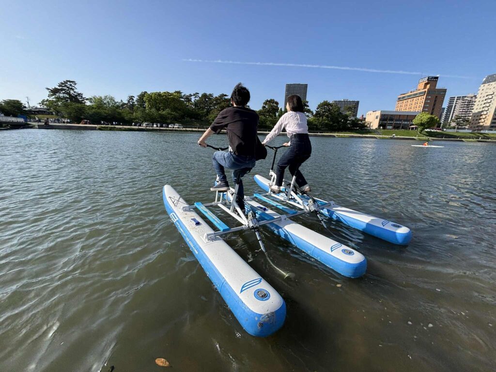 ペダルを漕いで水上を進む!?ちょっと変わった自転車「水上バイク」の体験会を実施します。安定感も抜群で、靴も濡れないのでどなたでも気軽に体験いただけます。水上バイクに乗って乙川の上を気持ちよく走りましょう。